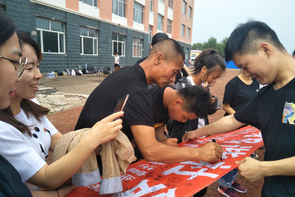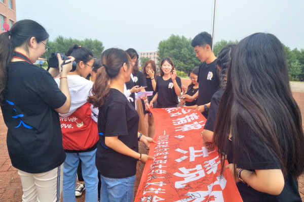 普法宣传条幅签字环节紧接普法情景剧表演。表演结束后,团委常务副书记杨云清发起“弘扬法治精神,共筑和谐社会”的倡议,全体师生在“弘扬法治精神,共筑和谐社会”的条幅上签字。通过这种互动的方式,学生们认识到,遵纪守法不仅要从心理上认同法律,更要从行动上以身作则。