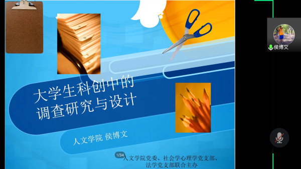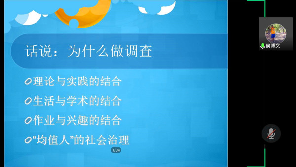 讲座伊始,侯博文老师以“为什么做调查”为引导,向师生们介绍了调查的原则、精神及调查想要解决的问题;随后,侯博文老师进一步深入指出研究问题与研究现象的区别,提出应将调查问题清晰化、指标体系结构化、抽象概念具体化等观点,并以生动的图片为例,与师生进行线上互动;接着,侯博文老师主要介绍了现代调研工具——问卷调查,向师生们细致讲解了问卷设计中的注意事项及常见错误,并简单介绍了问卷回收后的数据分析方法;而后,侯博文老师以在疫情期间发放的问卷为例,向师生们展示了设计问卷的具体方式;最后,侯博文老师向师生们分享了自己的学习经验与参与调查时的心得体会,并希望同学们在未来的学术研究和科创中应用数据分析。