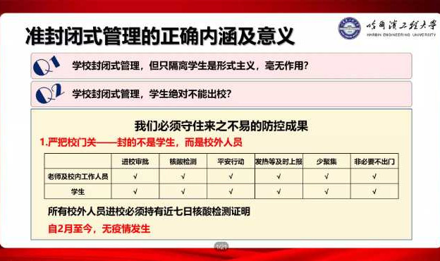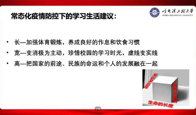 防疫课程开始,董春辉为学生们介绍了国内外新冠肺炎疫情的情况,并且介绍了预防新冠肺炎的方法。随后,董春辉用一段视频向大家介绍了中美高校对待疫情的不同态度与措施,展示了中国抗疫的不易,向同学们介绍了学校封闭式管理的内涵与意义。最后,董春辉向同学们提出了几条疫情防控下的学习生活建议。