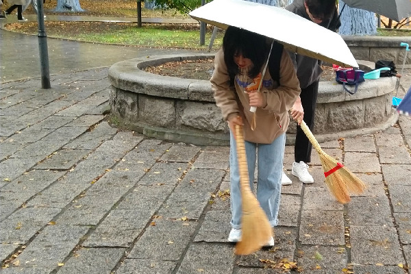 活动开始,学生手持预先准备的清扫工具,到达指定位置;随后,开始着手清理地面的枯叶,擦拭长椅,并徒手捡地上的枯枝;志愿者们在本次活动仔细清扫,使济海湾恢复了整洁干净。