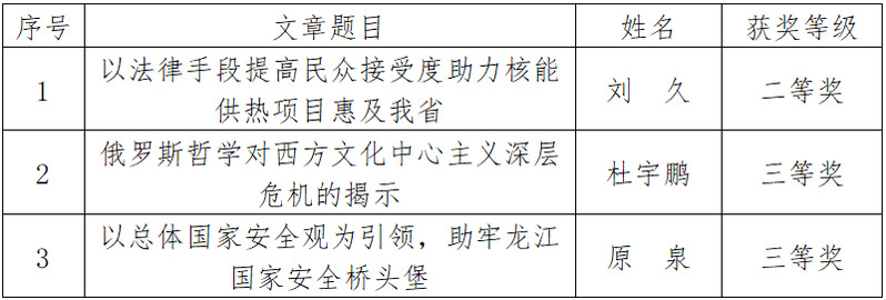 为深入贯彻落实习近平总书记重要讲话和重要指示批示精神,围绕省第十三次党代会提出的重大理论和实践问题,引领和激励全省社会科学工作者为推动龙江振兴发展提供智力支持,省社科联以“解放思想、振兴发展”为主题组织开展了论文征集和评审工作。共评选出获奖文章154篇,其中一等奖31篇,二等奖41篇,三等奖82篇。新捕京官网教师获奖共3项,其中二等奖1项、三等奖2项。