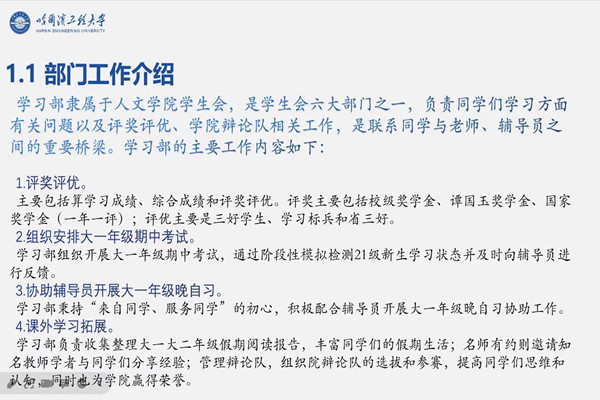 会议伊始,徐嘉悦为全体参会人员介绍本次会议的基本流程。随后,主席团成员、学习部、常务部、民族部、文艺部、体育部、权益部六个部门代表从部门职能、工作概述、工作反思、未来展望等多个方面依次进行述职汇报,回顾本学期各部门组织开展的各项活动并总结经验,为将来各部门发展进步及开展更多优秀活动奠定良好基础。
